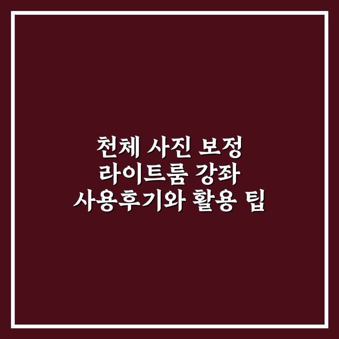 천체 사진 보정 라이트룸 강좌 사용후기와 활용 팁 2026년 03월 29일 작성자: 인포 천체 사진 보정 라이트룸 강좌를 통해 기본부터 실전 활용법까지 배우고, 효과적인 편집 팁을 확인하세요.